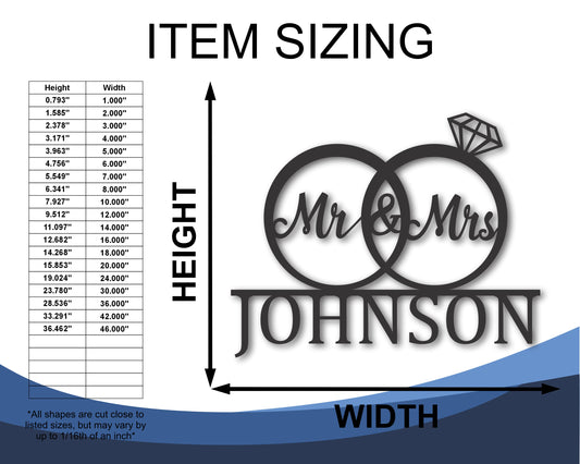 Custom Metal Mr and Mrs Rings Wall Art | Indoor Outdoor | Up to 46" | 20+ Color Options
