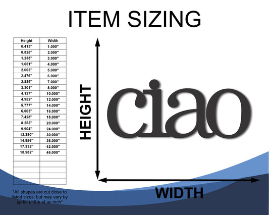 Custom Metal Ciao Wall Art | Indoor Outdoor | Up to 46" | 20+ Color Options
